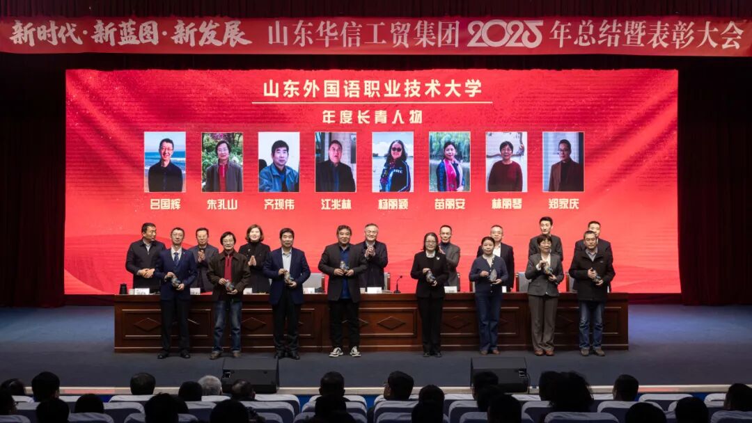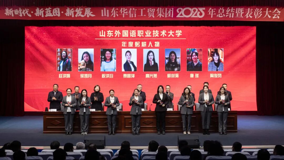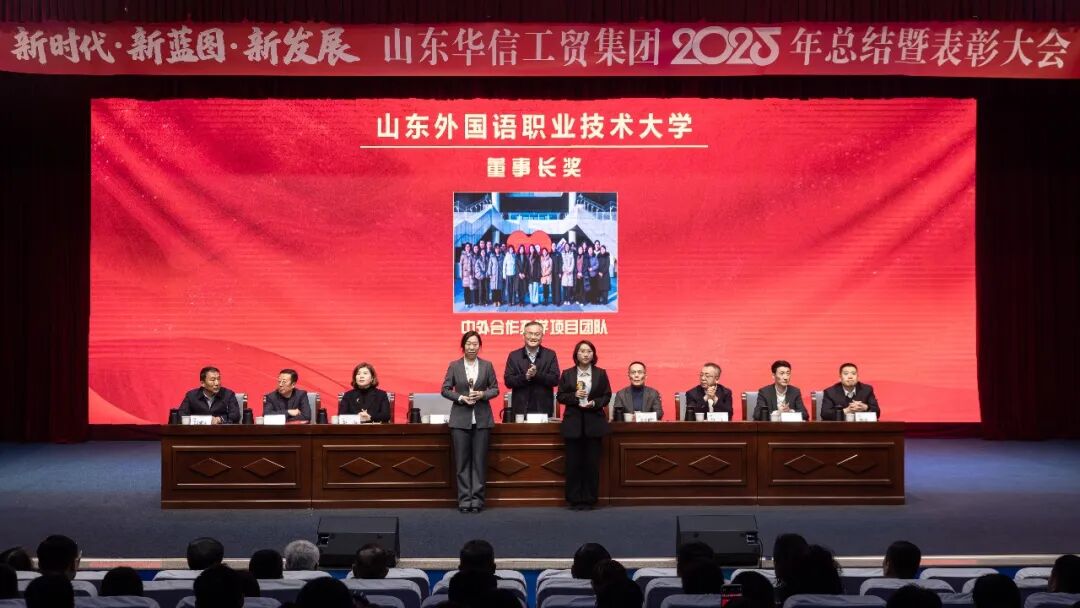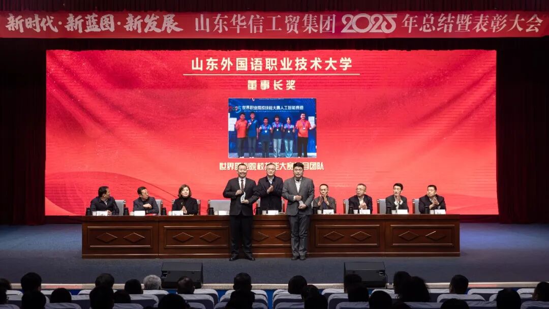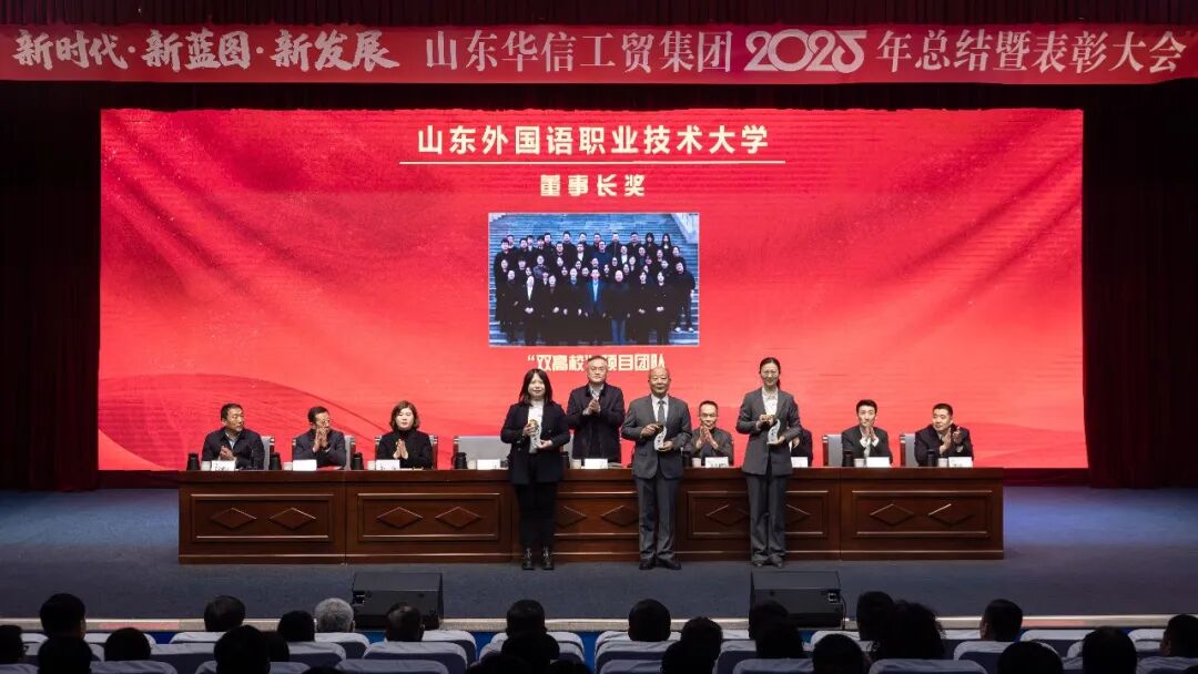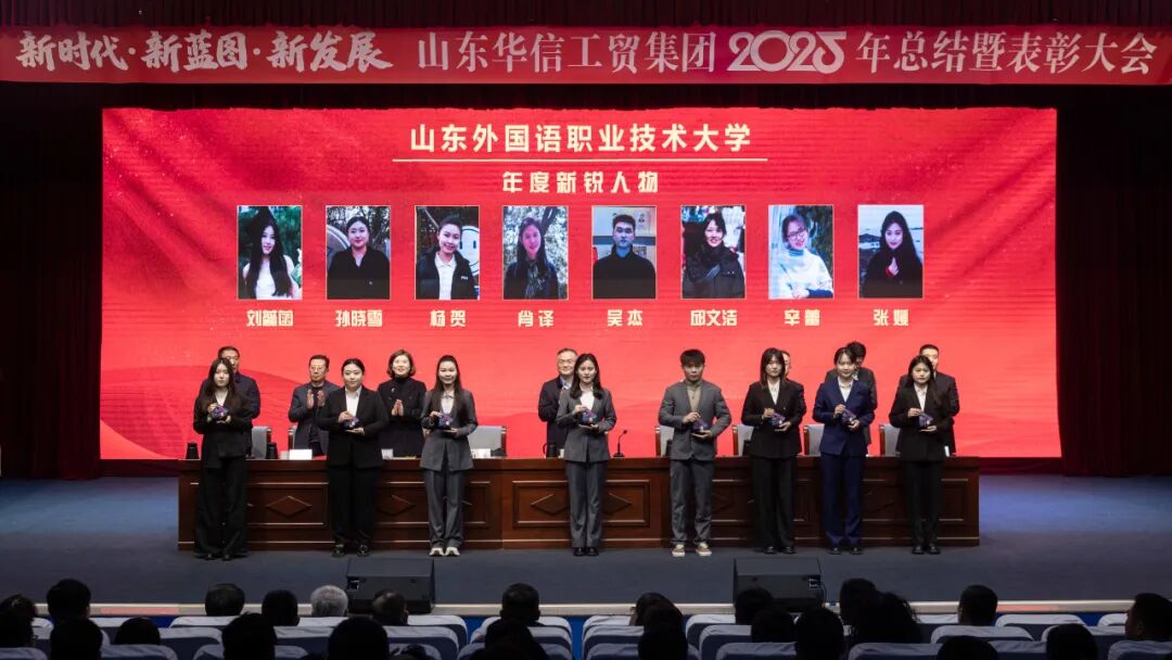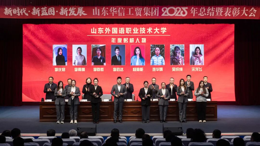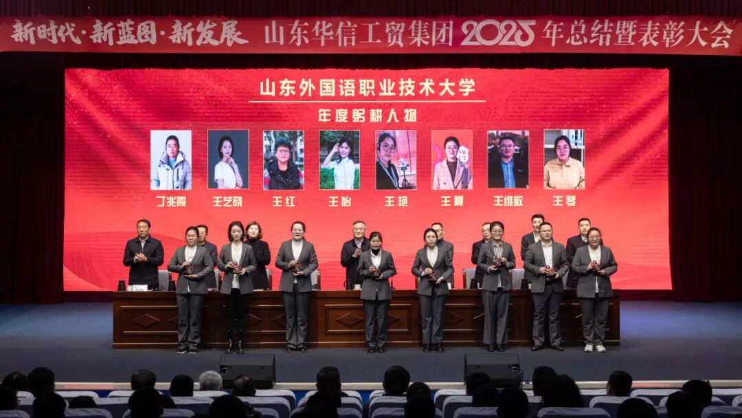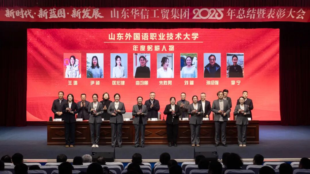 1月17日上午,山东华信工贸集团2025年总结大会暨表彰大会在山东外国语职业技术大学3号楼报告厅隆重举行。本次大会以 “新时代・新蓝图・新发展” 为主题,全面总结集团在 “十四五” 规划收官之年的奋斗成果,隆重表彰各业务板块先进典型,并就 2026 年 “十五五” 规划开局之年的战略发展作出系统部署。现场气氛庄重而热烈,在回望与展望中凝聚起全体华信人再谱新篇的磅礴力量。
