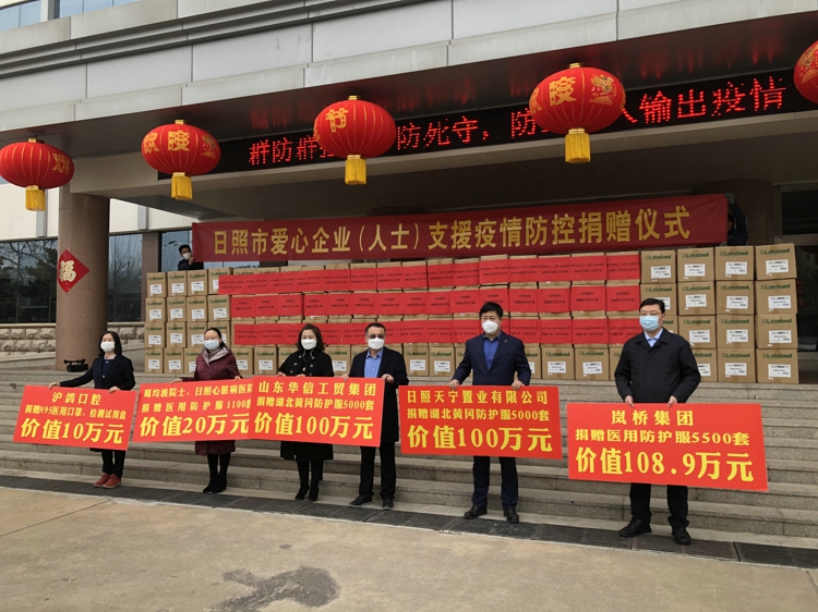 2月11日,日照市爱心企业(人士)支援疫情防控捐赠仪式在日照市卫健委举行,日照市委常委、副市长刘兆亮,日照市人民政府副秘书长庄会海,日照市民政局局长、市慈善总会常务副会长王录联,日照市卫健委主任张玉新,日照市应急管理局局长乔永前,日照市中医院党委书记丁伟出席仪式。山东华信工贸集团董事长拜文汇,山东华信工贸集团副总裁、山东外国语职业技术大学执行校长杜琳在仪式上向黄冈市慈善总会捐赠5000套防护服,价值100万元,用于支援黄冈市疫情防控。